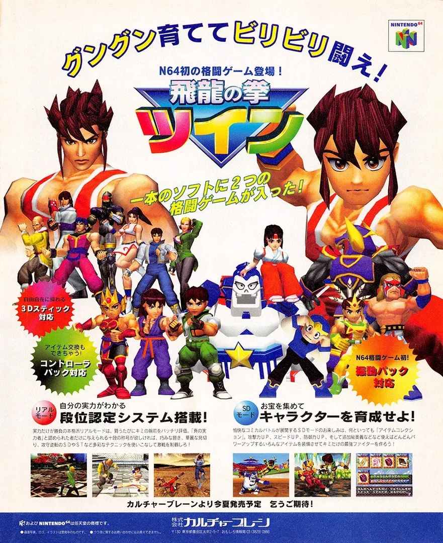 Create your ideal fighting game using the customizable interface. Choose between RPG-style and "virtual" tournament combat. The game has over 20 different characters and 200 different items. Save your characters on a Controller Pak and play them against your friends! While the Western version calls the two distinct game styles as "modes", the original Japanese version calls them as "games" in the in-game options, and as "games" and "modes" on advertisements.