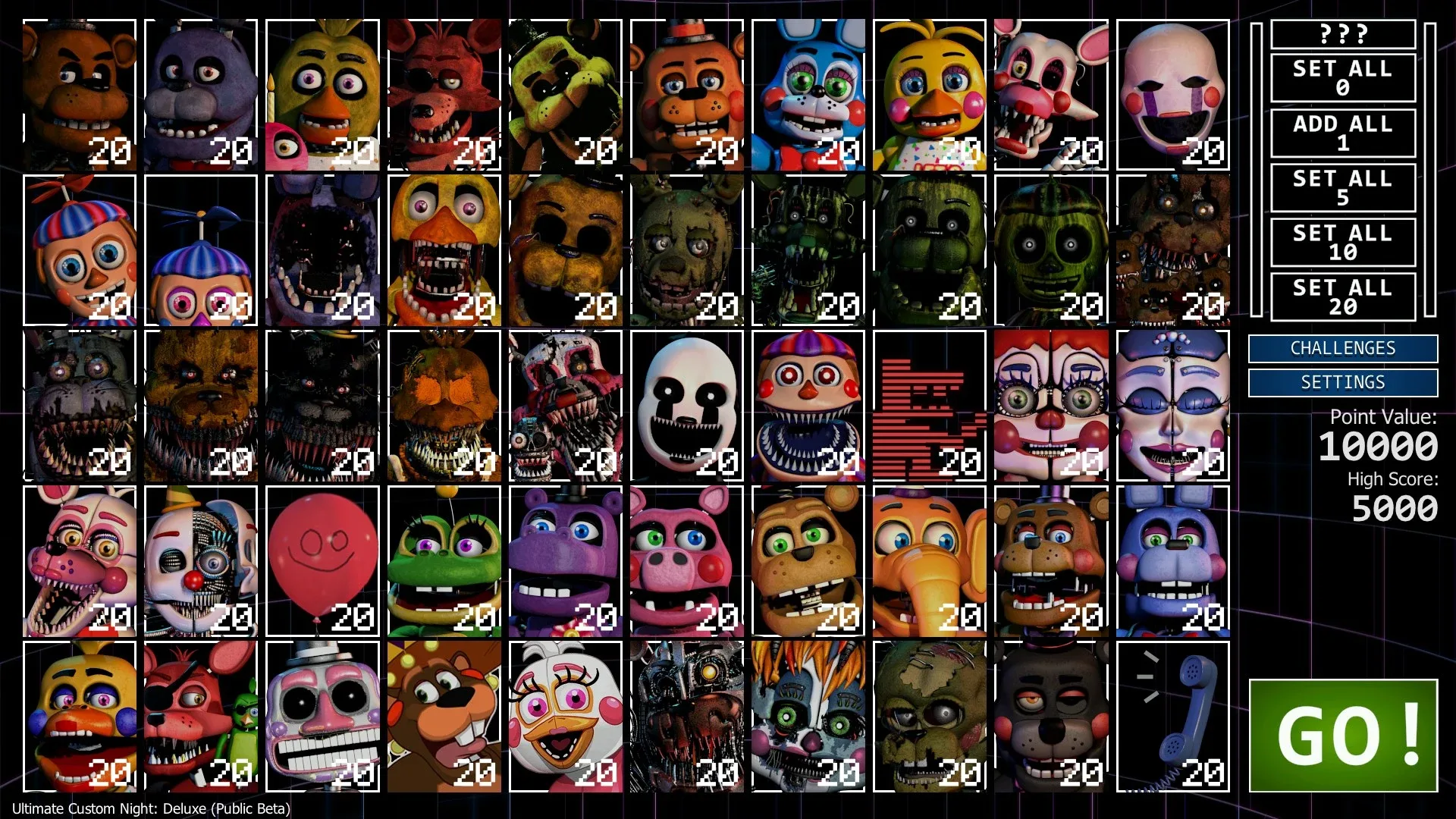 This is a modified and improved version of the ultimate FNAF mashup "Ultimate Custom Night" Test your skills against the 50 selectable animatronic foes spanning between seven different Five Nights at Freddy's games. The options for customization are nearly endless as you mix and match any assortment of these loved animatronic characters and set their difficulty anywhere from 0-20. From the office desk, you must manage two side doors, two vents, as well as two air ducts, all of which lead directly into your office.