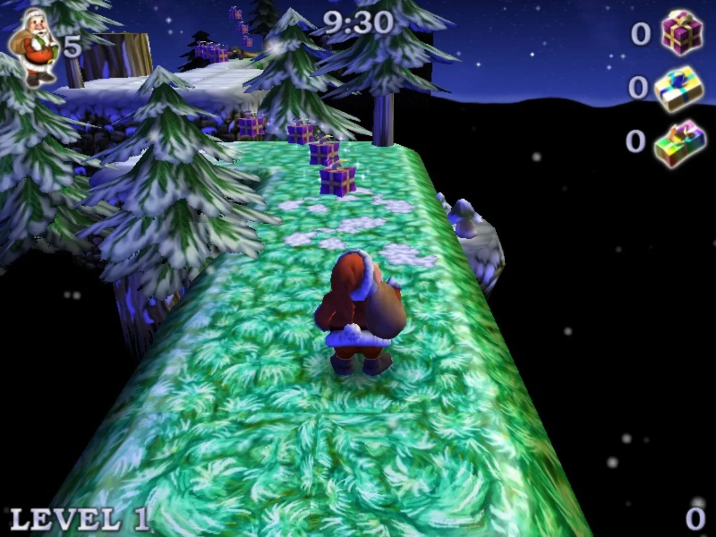 Santa Claus in Trouble ... again has the same premise as its predecessor: Santa Claus has lost all the presents. Now the player takes his role and has to retrieve them. This game is a standard 3D platformer, meaning the player uses his keyboard to jump through the 12 levels. He has to avoid pits and enemies. Since Santa is a peaceful guy there is no way to kill them. The basic goal of the level is to reach the exit alive. On the way the player finds the presents, for each one he collects he gets points - more challenging to get are more rewarding. There are also health boosts and reset points. But these are just temporary saves when the player dies - if all lives are lost or he ends the game he has to start all over.