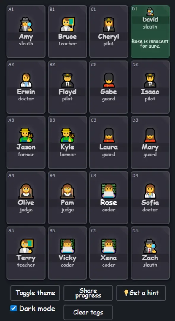 Clues By Sam is a free daily browser logic puzzle game where players use deductive reasoning to identify innocent and criminal suspects on a 4x5 grid. Players must apply logical reasoning based on provided clues to definitively label each suspect without guessing.
