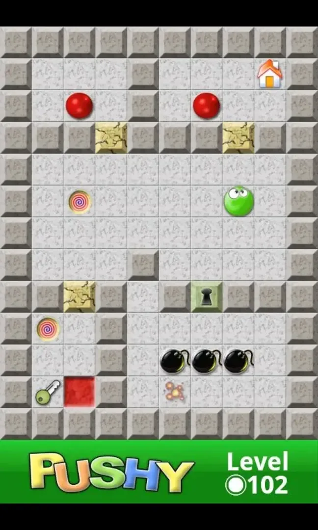 Meet Pushy, a small, friendly character who wants to be in his home. Before he can get there, however, there is a puzzle to solve. You move Pushy step by step and, through trial and error, determine how the different elements of the puzzle operate, and what tasks need to be done. For example, Pushy must move obstacles and dump a red ball into a red hole. After completing all relevant tasks, move Pushy to his home. If you solved everything correctly, you will advance to the next level!
