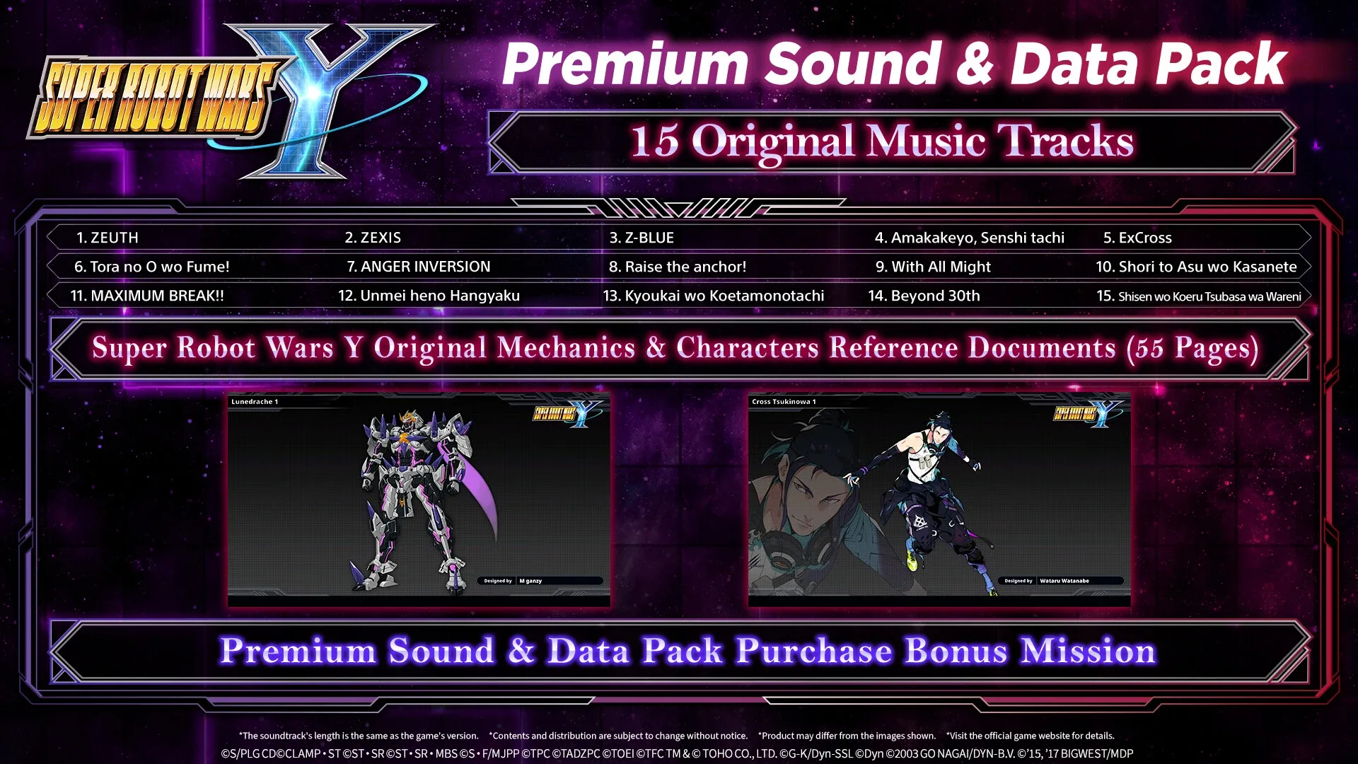 The Premium Sound & Data Pack includes the following content: 31 anime theme songs and sounds, 15 original music tracks, 55 pages of reference documents, including art and design documents, and 1 Bonus Mission.