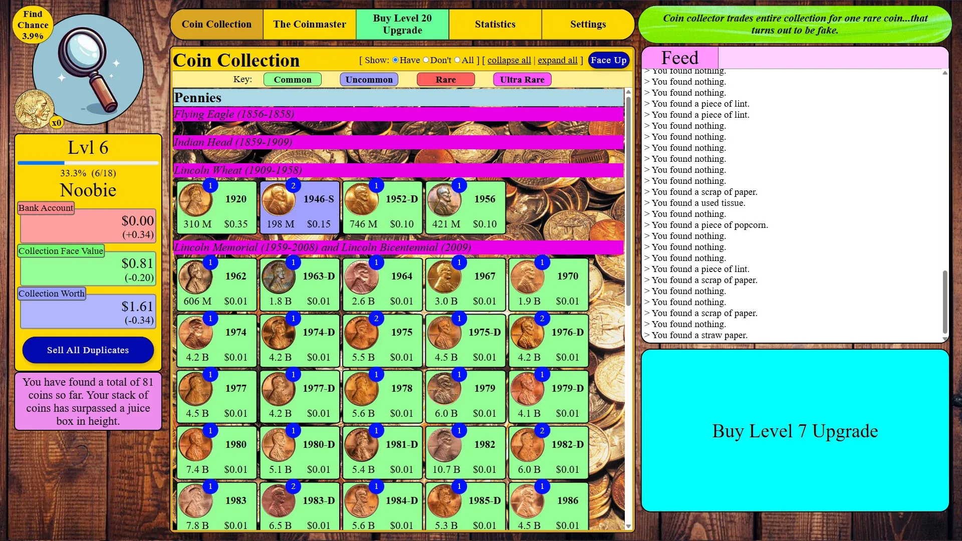 An incremental clicker game about collecting (fictitious) U.S. coins modeled after real data on coin mintages and values. Immerse yourself in this relaxing coin collector's dream. Listen to classical music while you search for coins. But be advised: finding all the coins is only the beginning...