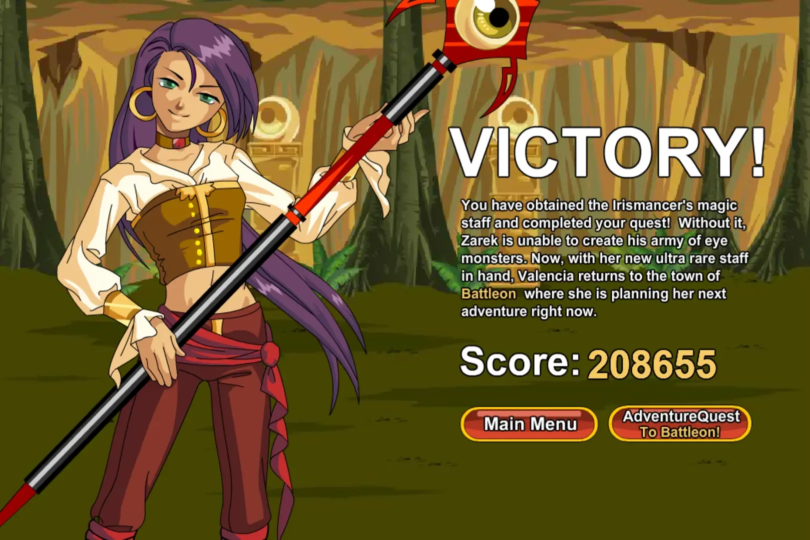 Zarek, the evil Irismancer, is plotting to unleash his army of eye monsters on the town of Battleon! Using his magical staff (rarity rating of 98.1) he can conjure and control these terrible creatures. Now it is up to Valencia to beating the bad guy and saving the world, even though she seems more interested into receiving the rare staff. It is said no self respecting treasure hunter could pass up a quest like this!