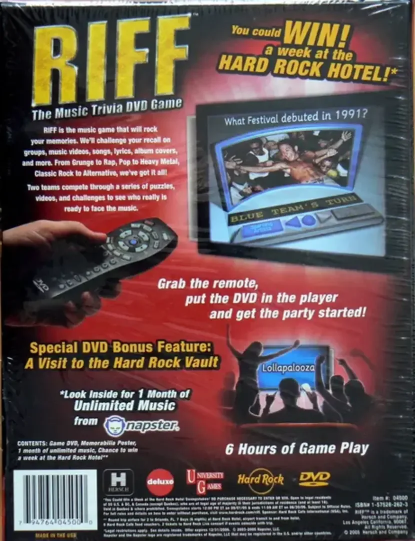 RIFF is the music game that will rock your memories. We'll challenge your recall on groups, music videos, songs, lyrics, album covers, and more. From Grunge to Rap, Pop to Heavy Metal, Classic rock to Alternative, we've got it all! Two teams compete through a series of puzzles, videos, and challenges to see who really is ready to face the music.