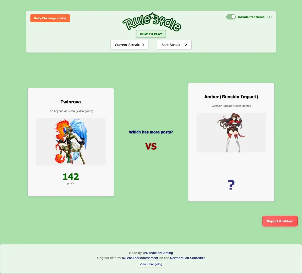 A guessing game in which players aim to guess which character or tag has a higher number of posts submitted to the Rule 34 website. Correct answers will allow players to maintain a streak and attempt to reach a high score.