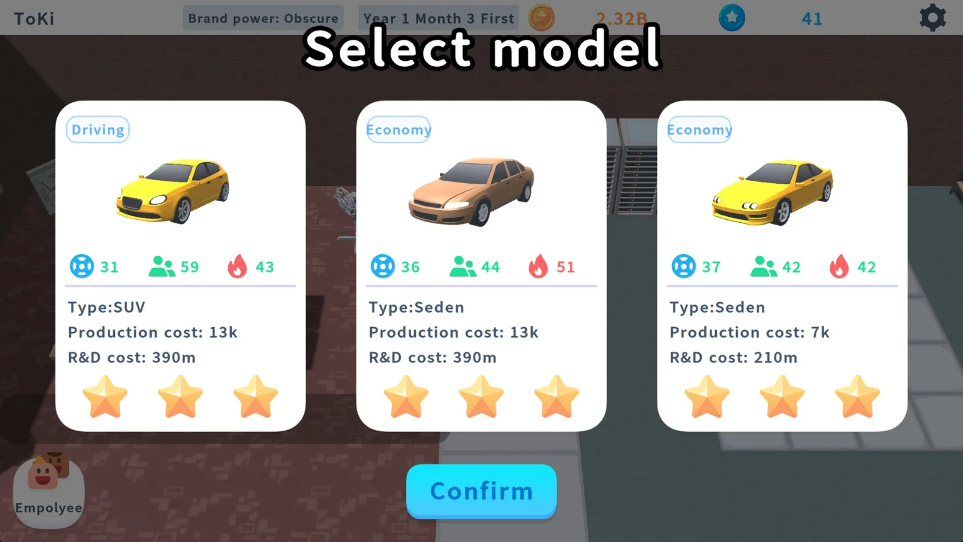 Welcome to "Car Tycoon", running your car company, hire employees to develop and produce cars, sell your cars, and become the best car company!