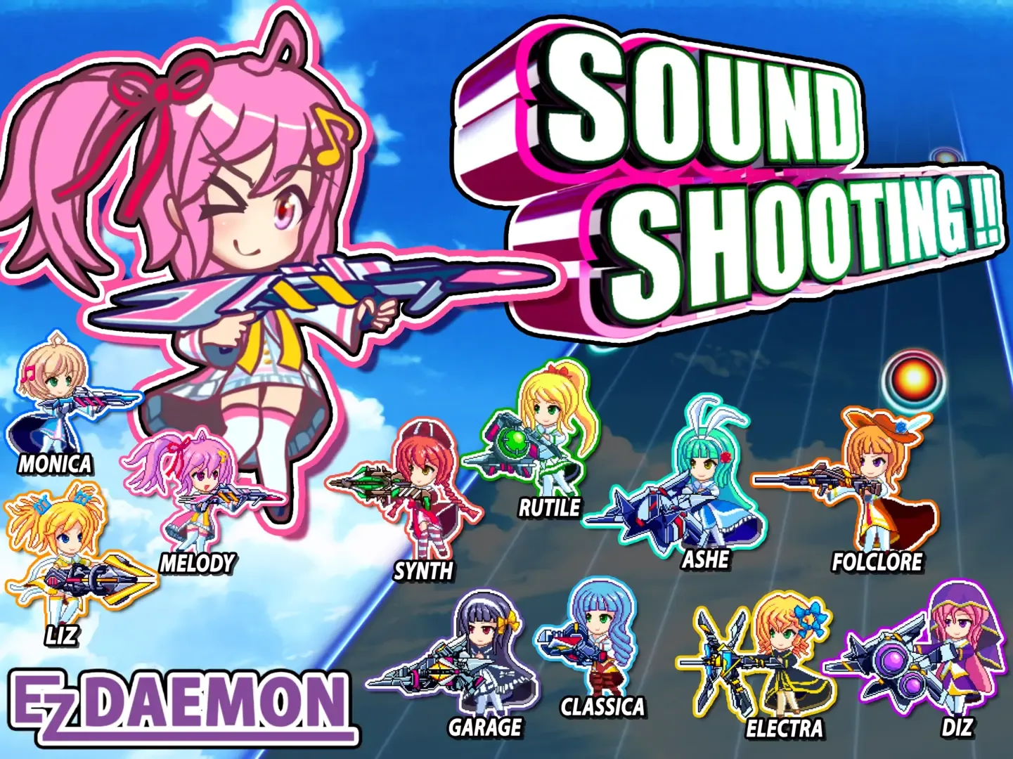 Rhythm game plus 2D shooter! Great for rhythm action and shooting game fans! So, is it a rhythm game or a shooting game? Play and check it out for yourself! With Monica, the clever and Liz, the wild, and to the cheerful music, beat the 8 bosses! Get ready to enjoy both the rhythm and shooting elements of the game!