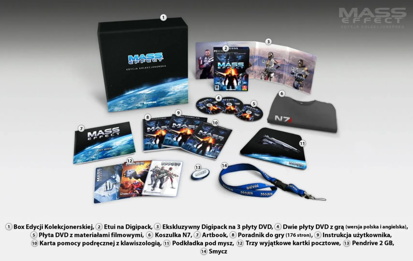 A Collector's Edition for the PC version of the game was sold exclusively in Poland and it featured the following content: - A black cardboard box with a print depicting a planet on the bottom half of the box, as well as the Mass Effect logo and the words "Edycji Kolekcjonerskiej" (Collector's Edition in Polish). - A DVD box housing the English and Polish copies of the game, and a bonus DVD (possibly the same found in the Xbox 360 Limited Collector's Edition). - A N7 t-shirt. - An art book (possibly the same found in the Xbox 360 Limited Collector's Edition). - A guide to the game in Polish. - A mouse pad featuring the Normandy. - Three postcards. - A 2 GB USB flash drive with the Mass Effect logo printed on it. - A blue lanyard with the Mass Effect logo repeated all over its length.