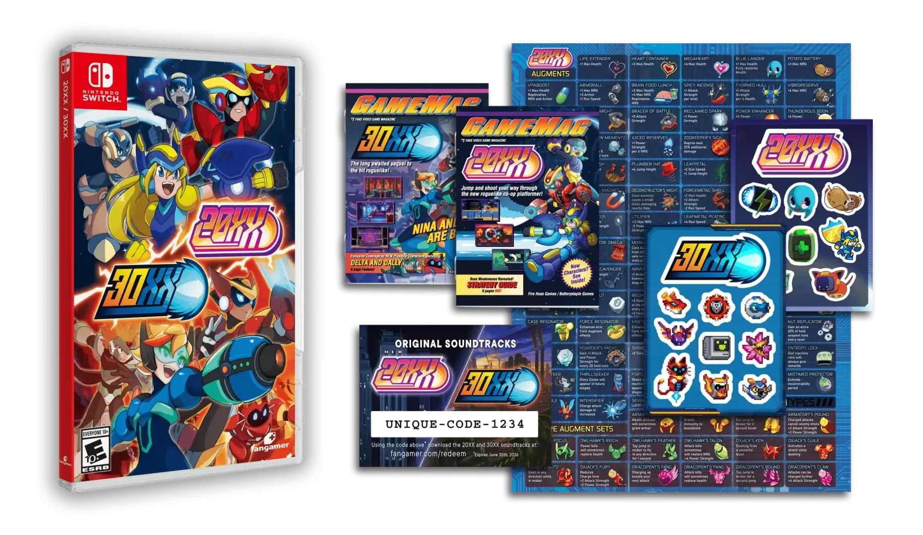 Jump, shoot, and slash your way through 20XX and 30XX in the ultimate co-op action-platformer roguelike collection! This physical edition includes both 20XX and 30XX for Nintendo Switch on a single Game Card, as well as: A double-sided 14 page instruction booklet featuring character bios and boss info A digital download code for a copy of the complete soundtrack Two kiss-cut sticker sheets A 9x12 inch double-sided folded poster with a comprehensive list of in-game augments on each side Reversible cover with double-sided artwork