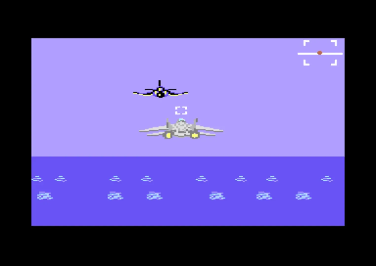 North American Commodore 64 port of After Burner II. Two versions exist for the Commodore 64, built by entirely different teams for different markets. The earlier North American version is played in full screen and is arguably the more accurate of the two, but runs slower, has a very limited HUD and has no in-game music. The European version, by contrast, is faster and has music, but plays in a window. There are also colour clashing issues when enemy planes are drawn above the ground, and the level order is different.