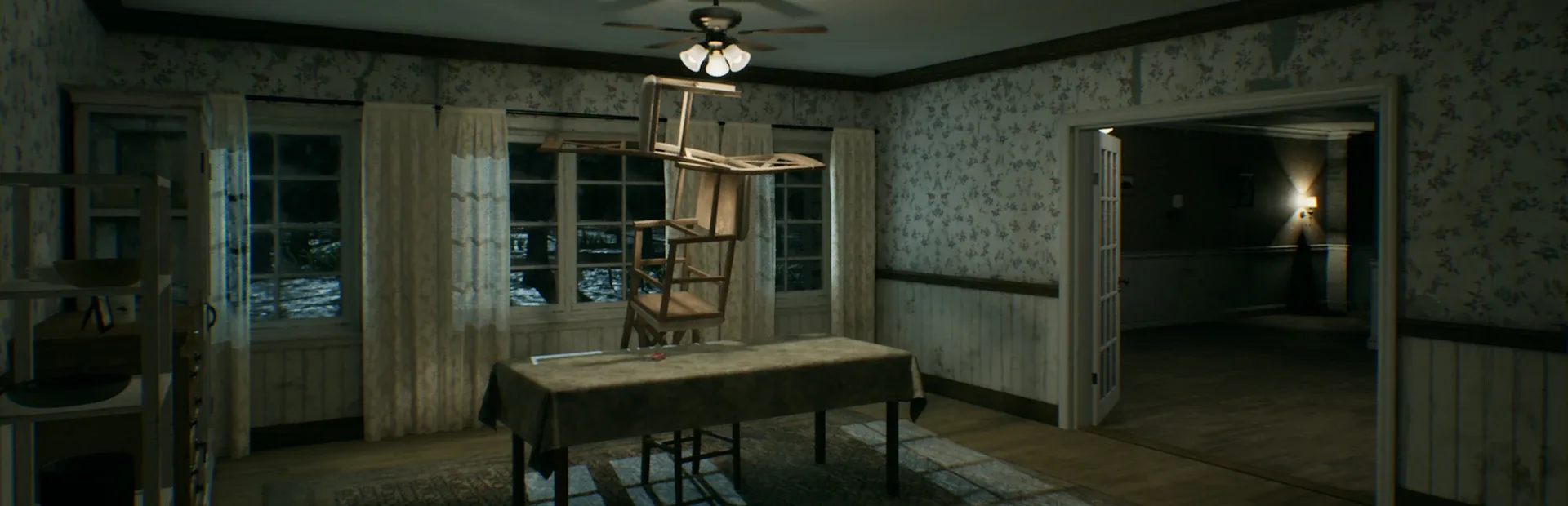 I found myself in a strange house and I'm scared. I think I got into some kind of loop. The house is constantly changing, surely I saw something inexplicable and terrible. I have to get out of here. Every time I go through a cycle, one of the chains on the basement door disappears. I should probably get in there and get out of here. I'm very scared.