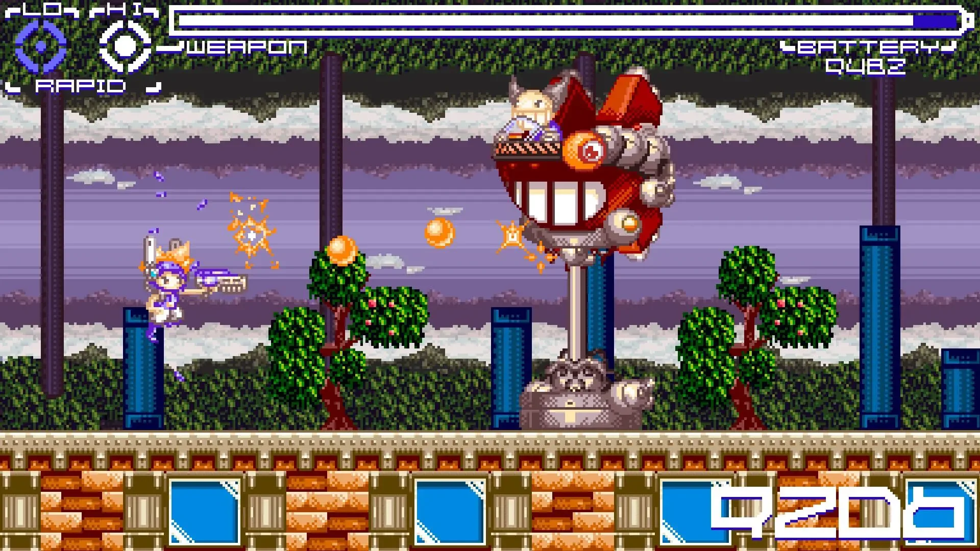 Blast through three stages defeating enemies and bosses as you go. Be careful though as your battery meter continually keeps losing power. You can toggle through two power modes, (low and high) to help crush the enemy. Collect pick ups, avoid traps and blast your way through victory!