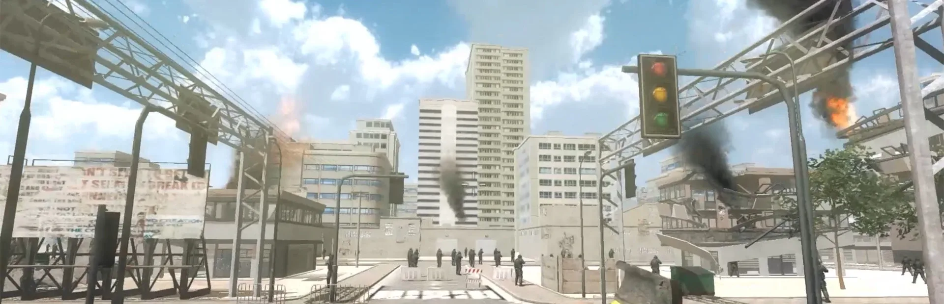 This is a first person action shooter game,The player is surrounded by enemy troops,Players are free to explore the surrounding area to familiarize themselves with the terrain,Players can kill or evade enemy attacks and must maintain health,Players are free to switch weapons or grab enemy