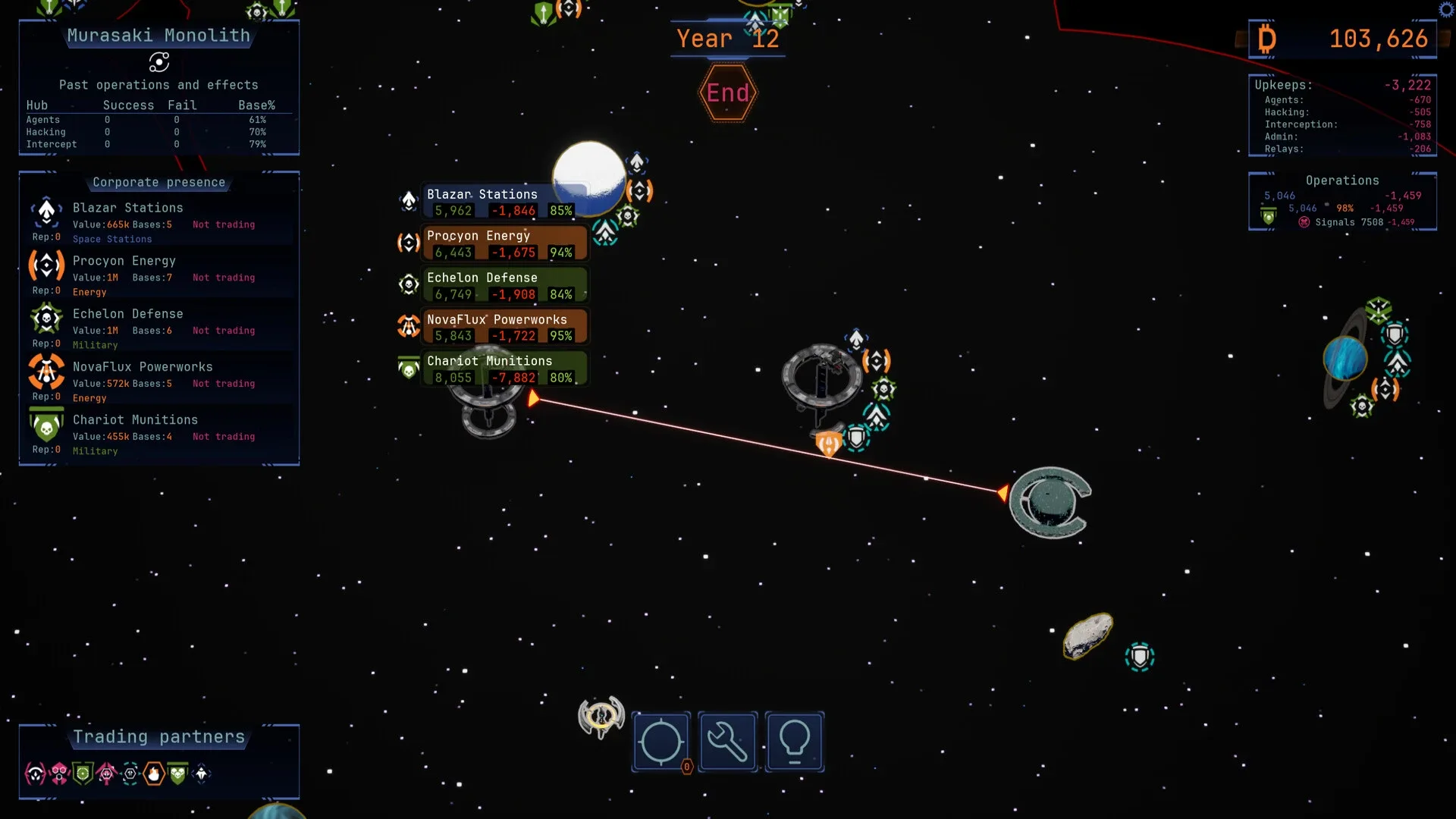 Manage an interstellar spy business in this strategy game with lunchbreak length runs. Explore a random universe, expand your espionage network, exploit weaknesses in corporate information security, and exterminate companies by strategic sale of their information to the competition.