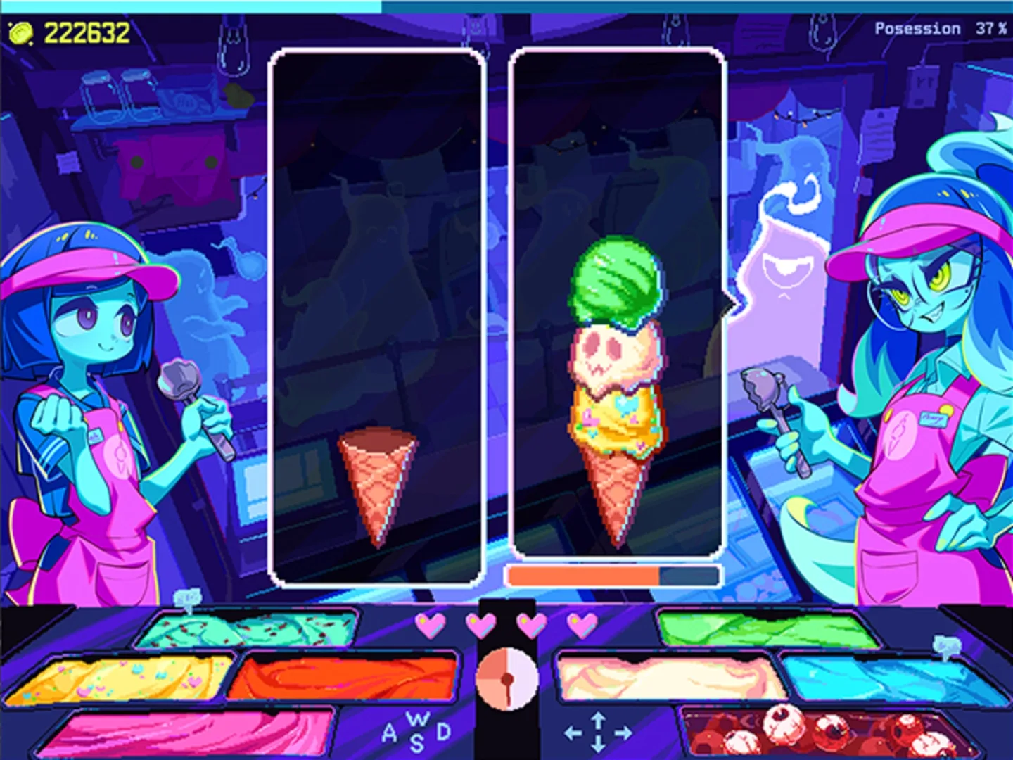 Haunted Ice Cream is a fast-paced time-management and rhythm simulation game where you play as a ghostly ice cream vendor serving spooky treats to restless spirits. Press the right keys in perfect timing to scoop and stack eerie flavors before your possession meter overflows, all wrapped in vibrant neon pixel art and ghostly charm.