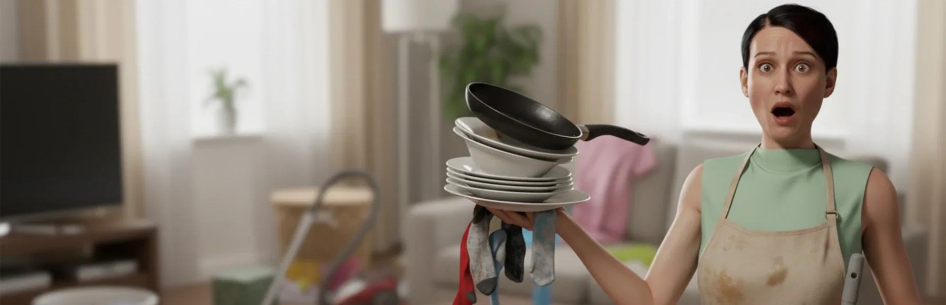 Experience life as a woman - cleaning, cooking, laundry, and no time to rest. Full immersion into the world of everyday chaos!