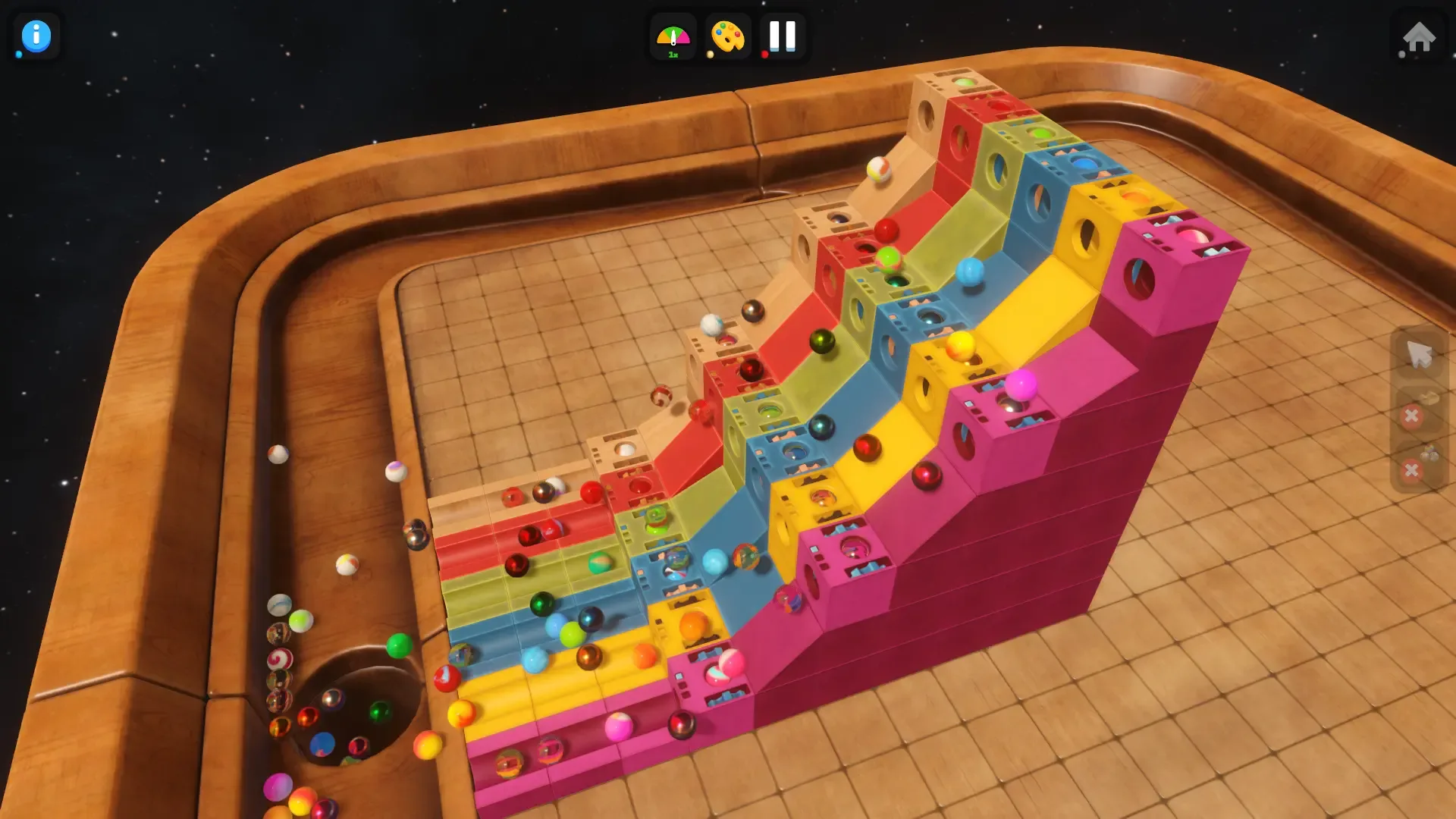 On a wooden table drifting through space, build little contraptions just to see what happens. Release the marbles and enjoy the calm rhythm of their flow. A warm, curious, and delightful sandbox experience.