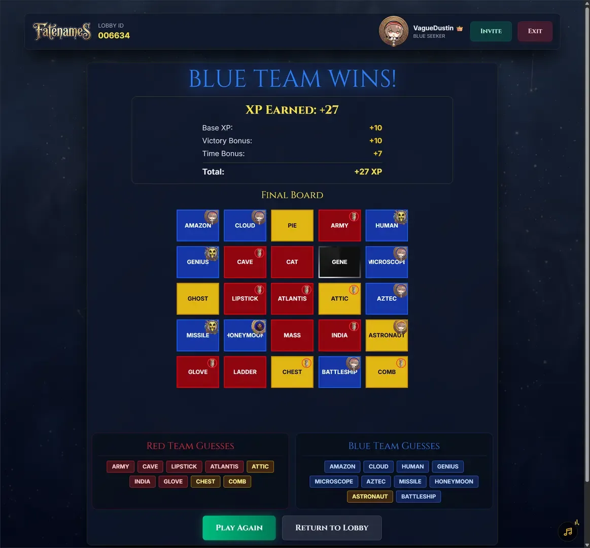 Fatenames is a team-based word deduction game. Two teams, Red and Blue, compete to reveal their Fates first. Fateweavers give one-word clues that can point to multiple words on the board. Their teammates (Seekers) try to guess words of the right color while avoiding those that belong to the opposing team. And everyone wants to avoid the Disaster.