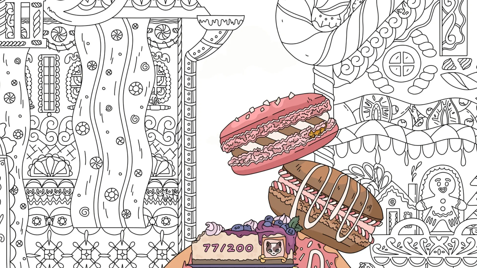 Explore the sweet gingerbread town while finding cute cats and paint black - white locations with colored paints.
