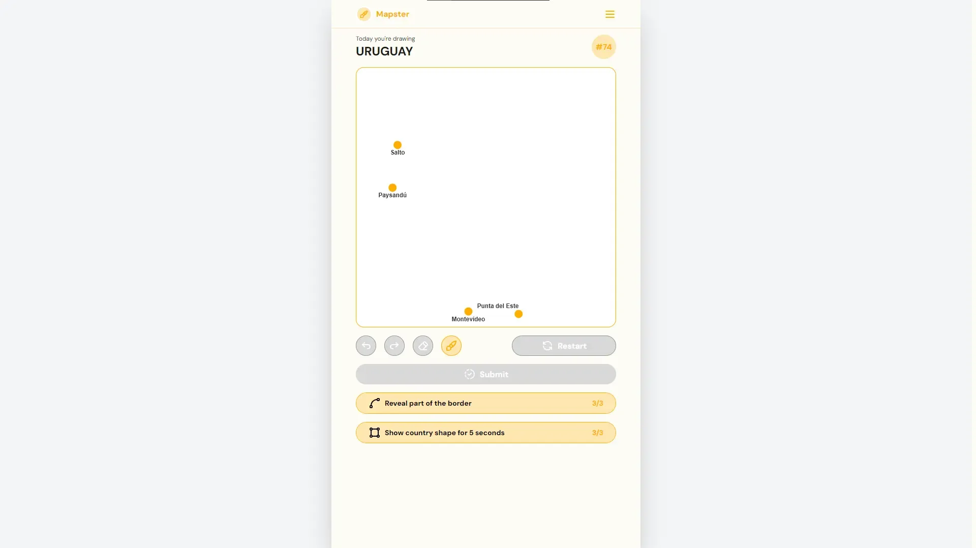 Test your mapmaking skills — draw country maps from scratch! Each day you’ll be asked to draw the outline of a country. Kind of like Worldle, but the other way around. There’s only one country per day, so come back tomorrow for a new one!