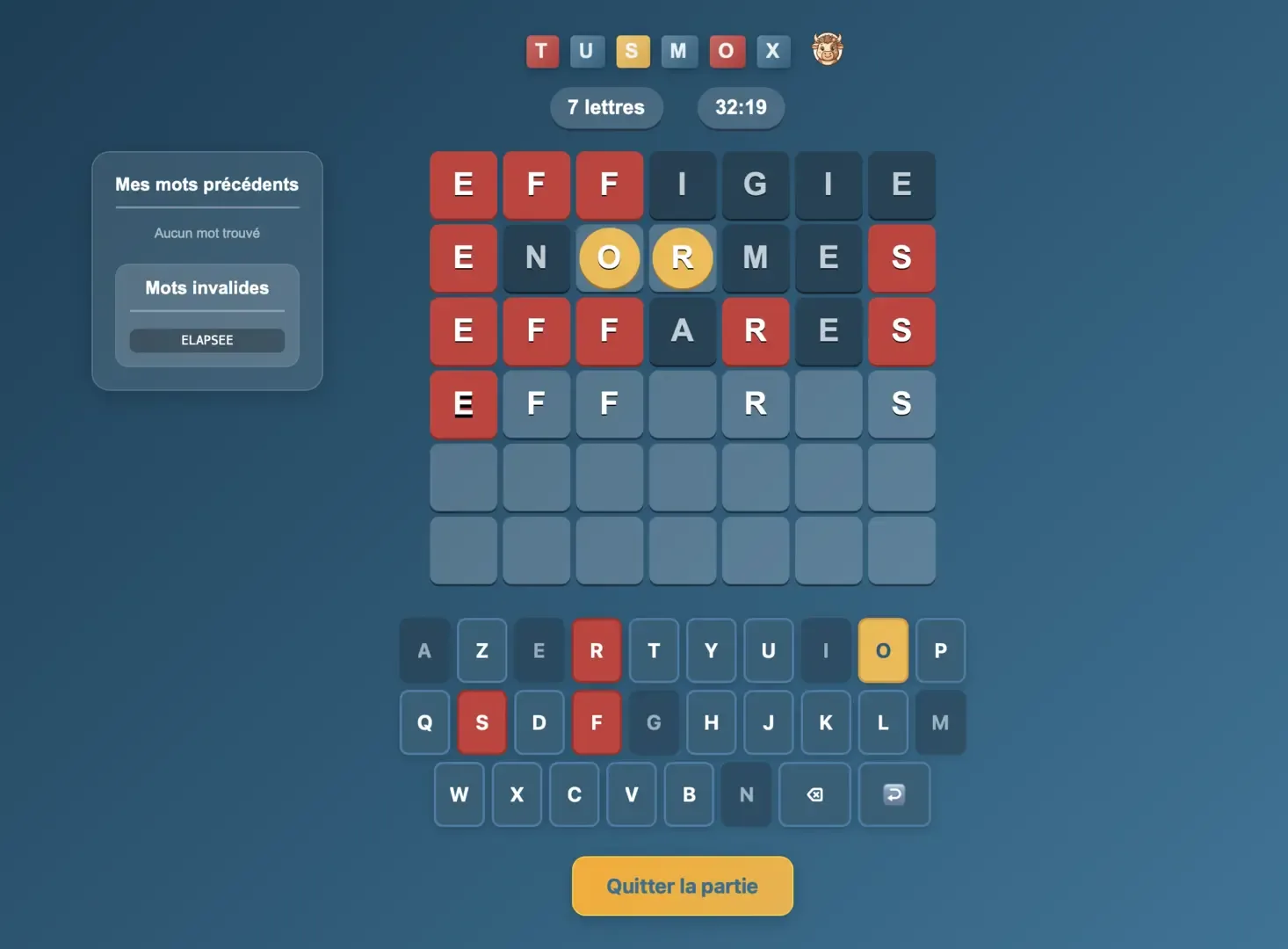Tusmox is a word-game based on the rules of the French TV show Motus, similar to Wordle. It can be played either with friends or alone, and was developed following the discontinuation of the "Tusmo" game.