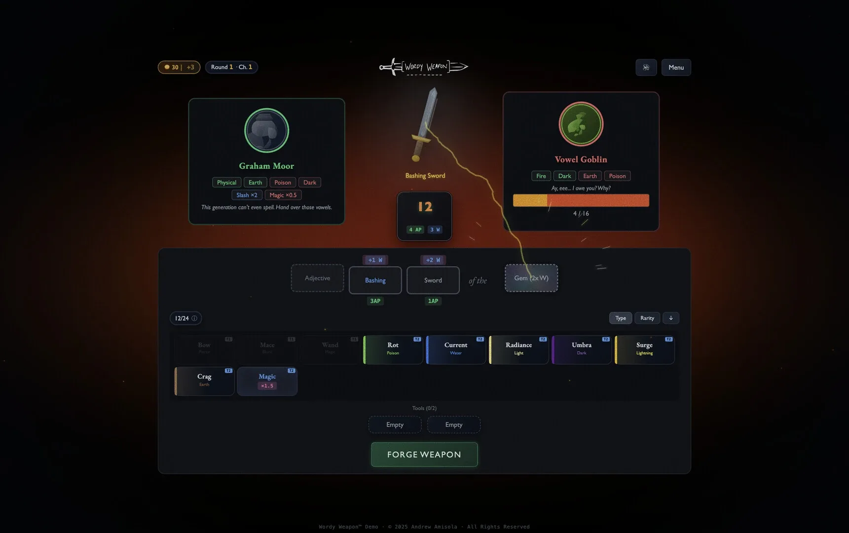 A word-crafting roguelite! As the Wordsmith, fill in the blanks with Adjectives & Nouns to forge ridiculous weapons with RPG-style names and defeat your enemies.
