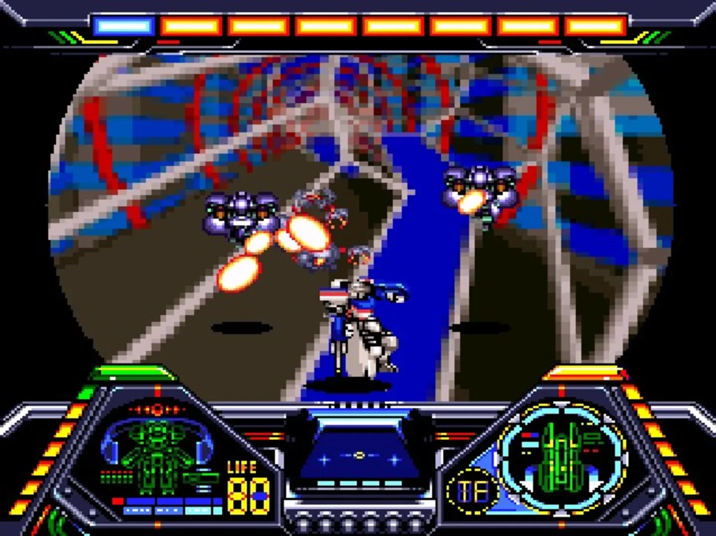 Players progress through the game as a robot racing through a pipe, shooting everything that moves. The robot can shoot from both arms, jump, kick and punch. There are also power-ups and bonuses that can be collected to upgrade the robot's weapons and armor. There are three different types of robots to choose from: Silver Mare, Beliws, and Nitika. Weapons are chosen before each stage and every level has Mode 7 graphics. Three difficulty levels can be chosen; ranging from easy, medium, and hard.
