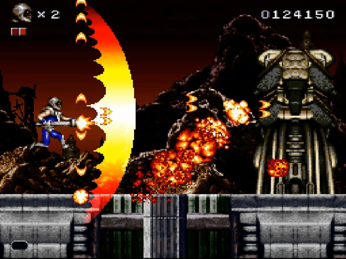 Rendering Ranger R2 is an action game developed by Rainbow Arts and published by Virgin Interactive in 1995 for the Super Famicom in Japan only. The game was slated to be released in western territories under the name Targa, but this version ended cancelled due to Rainbow Arts being unable to secure a publisher at the time. The game was created by Manfred Trenz, utilizing pre-rendered graphics. Players control the titular Rendering Ranger, a special forces soldier tasked with defending the Earth and its remaining inhabitants from a devastating alien invasion. A high score screen is present and there are many different types of laser guns to acquire throughout the post-apocalyptic adventure. The player can choose from three to seven lives. However, there are no continues so practice is essential to winning the game. The player can take five hits before losing a life but pits automatically make him lose a life. Weapons are found in floating orbs, and each color holds a different kind of gun.