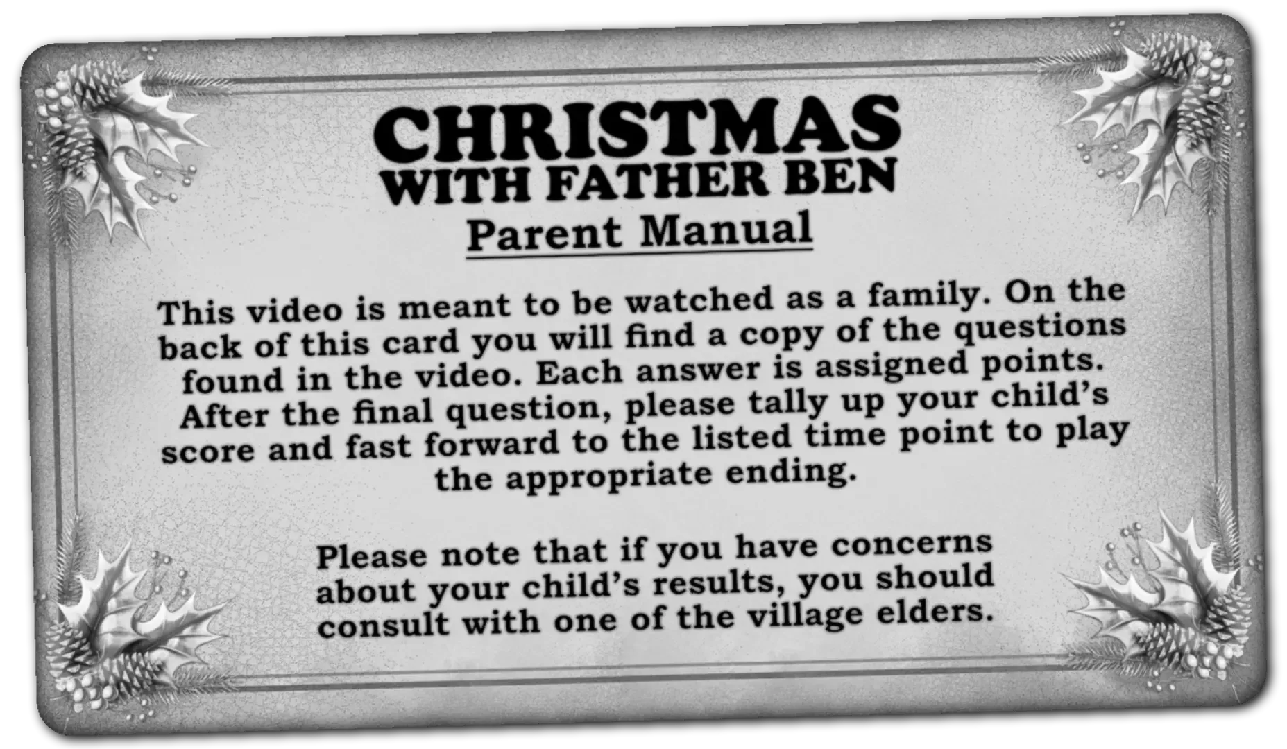Hidden beneath the rotting floorboards of an abandoned house in a forgotten village in the dead of winter. A videotape that simply reads “Christmas with Father Ben.” Let curiosity take hold and experience what might be the darkest Christmas Special ever made. "Christmas with Father Ben" is a short interactive experience that draws inspiration from Rankin/Bass stop-motion Christmas specials and real-life disturbing events.