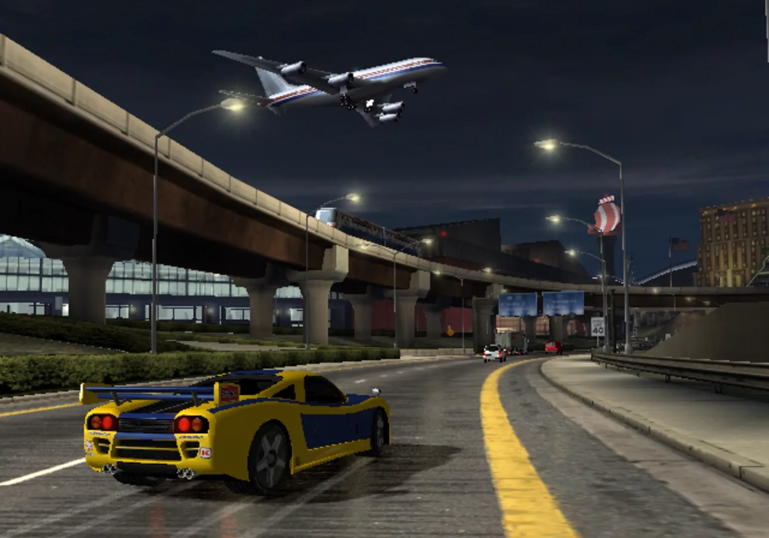 Burnout is a street racing game focused around speed and crashing. Unlike many games which focus on closed course driving, you get to drive through cities with real traffic and city infrastructure. Designers have built an entire city and surrounding areas, and implement the race courses throughput the countie's streets. As a result, many times certain parts of race-courses interlace with other parts of other races. As well, instead of encouraging strategic driving and safe driving, Burnout strongly encourages offensive driving. Driving on the wrong side of the road, barely missing passing traffic, drifting, and jumps all add to your boost "burnout" meter. Speed boosts and jumps aid your attempt to dive past buses, trucks and anything else that gets in the way. The more offensive and dangerous your driving is, the more boost you get!