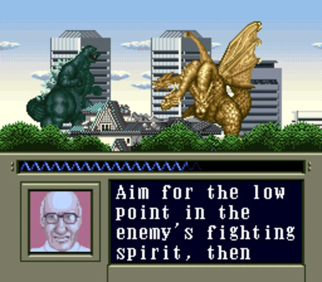 Super Godzilla is a 16-bit Godzilla game where the player can take control of Toho's famous big green lizard as they rampage through Japan. The game is divided into two main gameplay modes, Movement and Battle. Movement has the player travel through the city using the D-pad and a map located on the bottom of the screen with the objective being to destroy certain objectives such as enemy humans and buildings as well as pick up power-ups. There is an animation in the screen above the map that shows the results of their movements and attacks. Battle mode kicks in when the player locates an enemy on the map, like Biollante or Mechagodzilla, and is taken to a side-scrolling cinematic-style battle where the player must use punches, tail whips and the famous fire breath to drain the energy of the opposing monster. However, the Fighting Spirit system is present which is in a sense a morality meter where the player must pick the right attacks at the right time in order to connect certain attacks. Choosing the wrong attacks or failing to connect with them will cause the meter to drop and make Godzilla more vulnerable to attack.