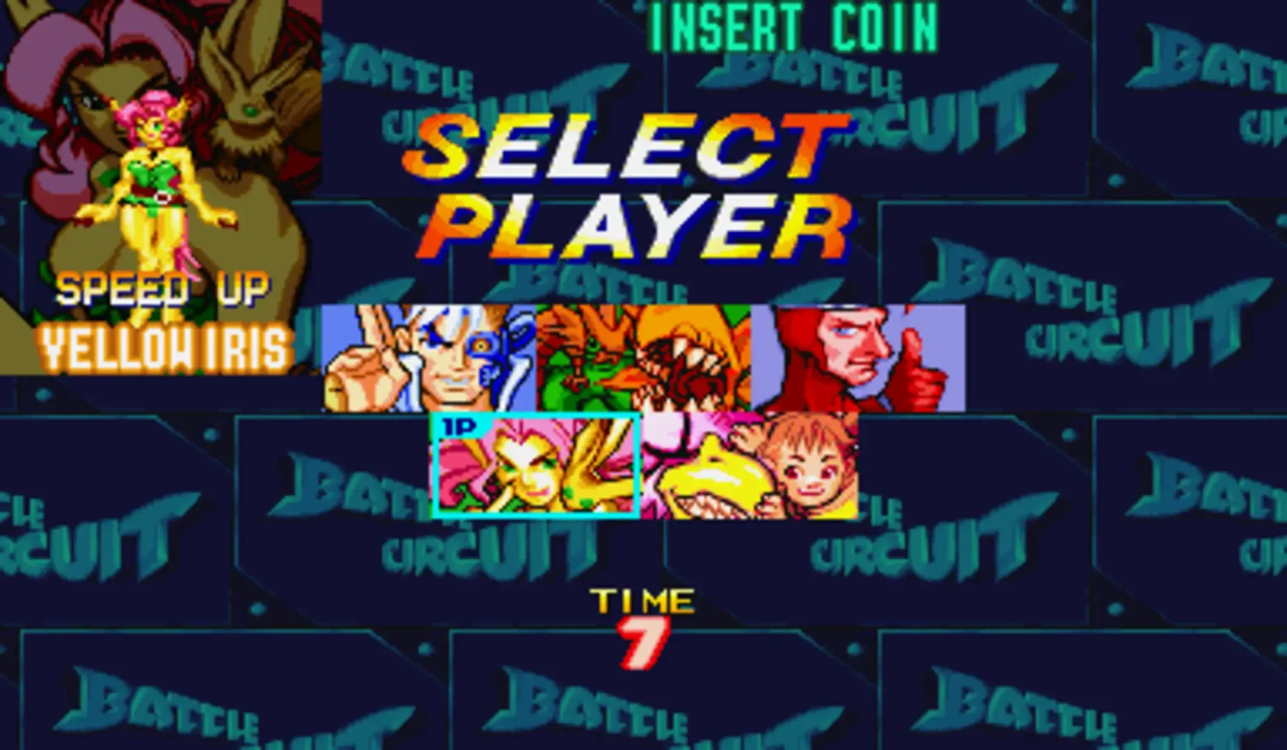 Battle Circuit is a 2D side scrolling beat'em up drawn in a comic (manga) style in a futuristic science fiction setting. A group of bounty hunters must capture the mad scientist Dr. Saturn with a giant head. The roster of heroes has 5 characters for the player to choose from: Cyber Blue, a human bounty hunter with cybernetic attachments to his body; Captain Silver, a humanoid shape-shifting hunter who has ability to project ice particles from his body; Pink Ostrich, a large, sentient, pink ostrich, who is always accompanied by its owner, a young girl named Pola Abdul; Yellow Iris, a part-time fashion model with claws and Alien Green, a space creature looking like a giant, moving plant. Gameplay is quite typical for the genre, like in Final Fight, Streets of Rage, or Cadillacs and Dinosaurs - players go right, beat the enemies (player has access to various attacks), collect bonuses and money, and fight against bosses, for example Dr. Saturn and his robots. Players' abilities can be expanded by purchasing special "upgrade discs" after the completion of levels using coins obtained from dead enemies.