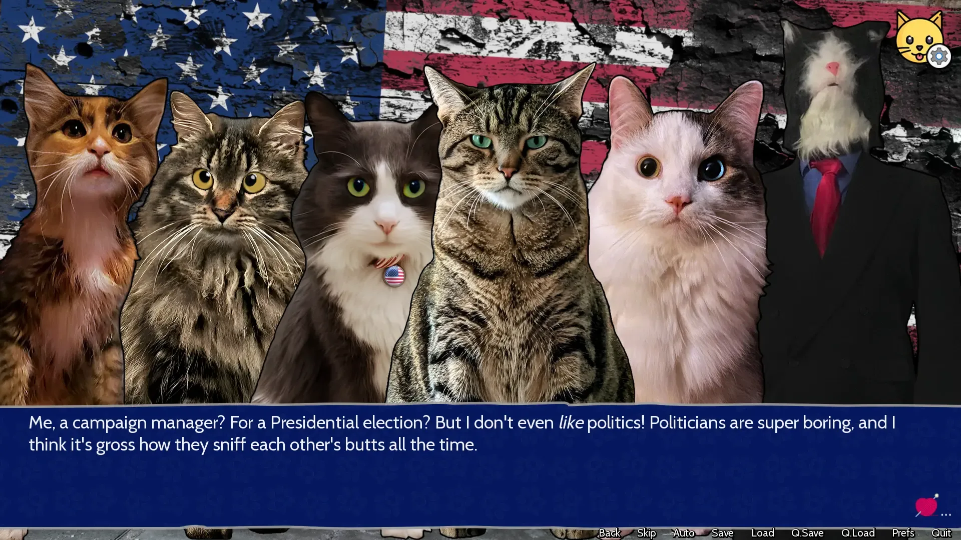 In a world where pets run the government, President DJ Nibbles has spent most of his time lying in sunbeams and using his desk as a scratching post. But now his days of zoomies in the Oval Office are coming to a close, as the U.S. prepares to elect its next Cat President! Six wildly incompetent candidates are throwing their yarn balls into the ring, each more dysfunctional than the last. You’re the human campaign manager tasked with keeping these adorable candidates out of trouble. Wrangle egos, dodge scandals, fall in love, and maybe even save the country...or make it much, much worse. With a script that’s nearly 100,000 words long, Cat President: 3rd-Rate Candidate is a visual novel packed full of romance, humor and cute pictures of real cats. Whether you’re a campaign veteran or just here for the musical numbers and fur-flying debates, it’s the most paws-itively absurd political simulator you’ll ever play.