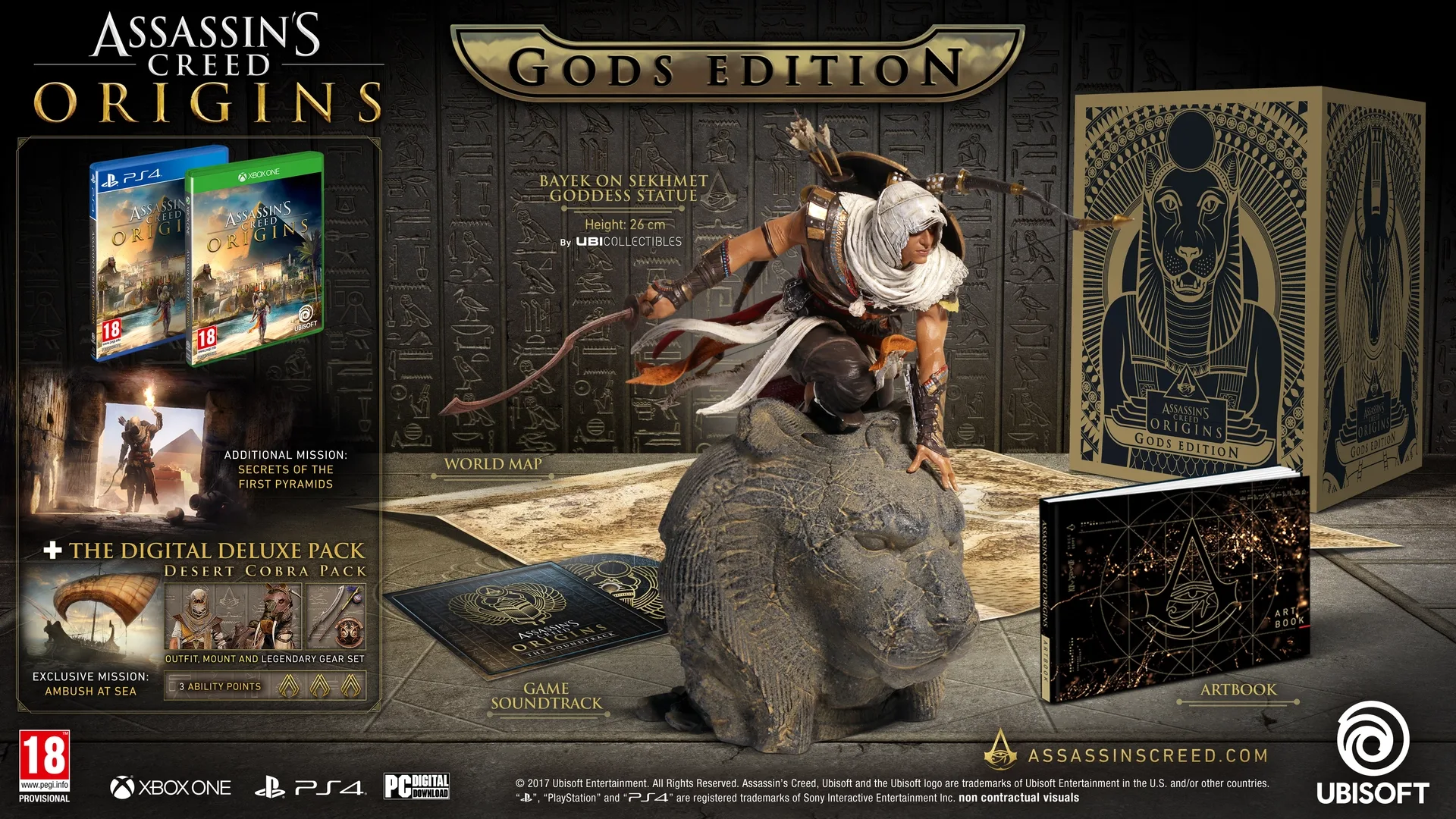 Unveil forgotten myths of the mighty Egyptian Gods with the Assassin’s Creed Origins – Gods Collector’s Edition. Featuring Bayek, a protector of Egypt whose personal story will lead to the creation of the Assassin’s Brotherhood, standing on the statue of Sekhmet, the lioness goddess. Gods Editions content: High-end: Bayek’s on Sekhmet Goddess statue (height 26cm) - By Ubicollectibles. Premium Egyptian Gods themed package. The Assassin’s Creed Origins Standard Edition, the Digital Deluxe Pack and an additional mission. The game’s art book: Featuring the artworks from Ubisoft Montreal artists that lead to the creation of the game. The world map: Explore the Egypt of Assassin’s Creed Origins with this hand-drawn artistic representation. The game’s official soundtrack.