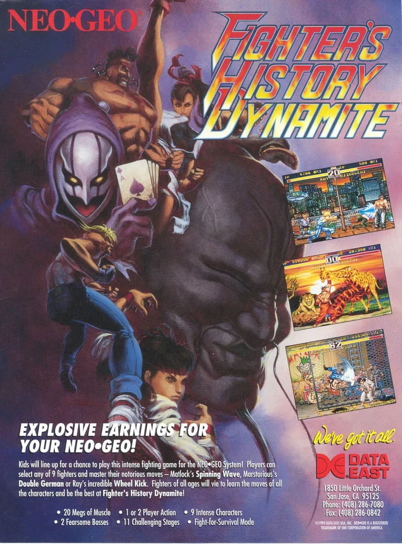 Karnov's Revenge, also known as "Fighter's History Dynamite" in Japan, is a 1994 arcade fighting game, and the followup to Fighter's History. All returning characters have new moves, and Clown and Karnov are now playable characters while newcomers Zazie and Yungmie were introduced. The Super Famicom game "Fighter's History: Mizoguchi Kiki Ippatsu!!" is heavily based on Dynamite, and is believed to have been meant as a port. Dynamite itself would be ported to the Sega Saturn, and Mizoguchi Kiki Ippatsu!! was even thrown in as a bonus.