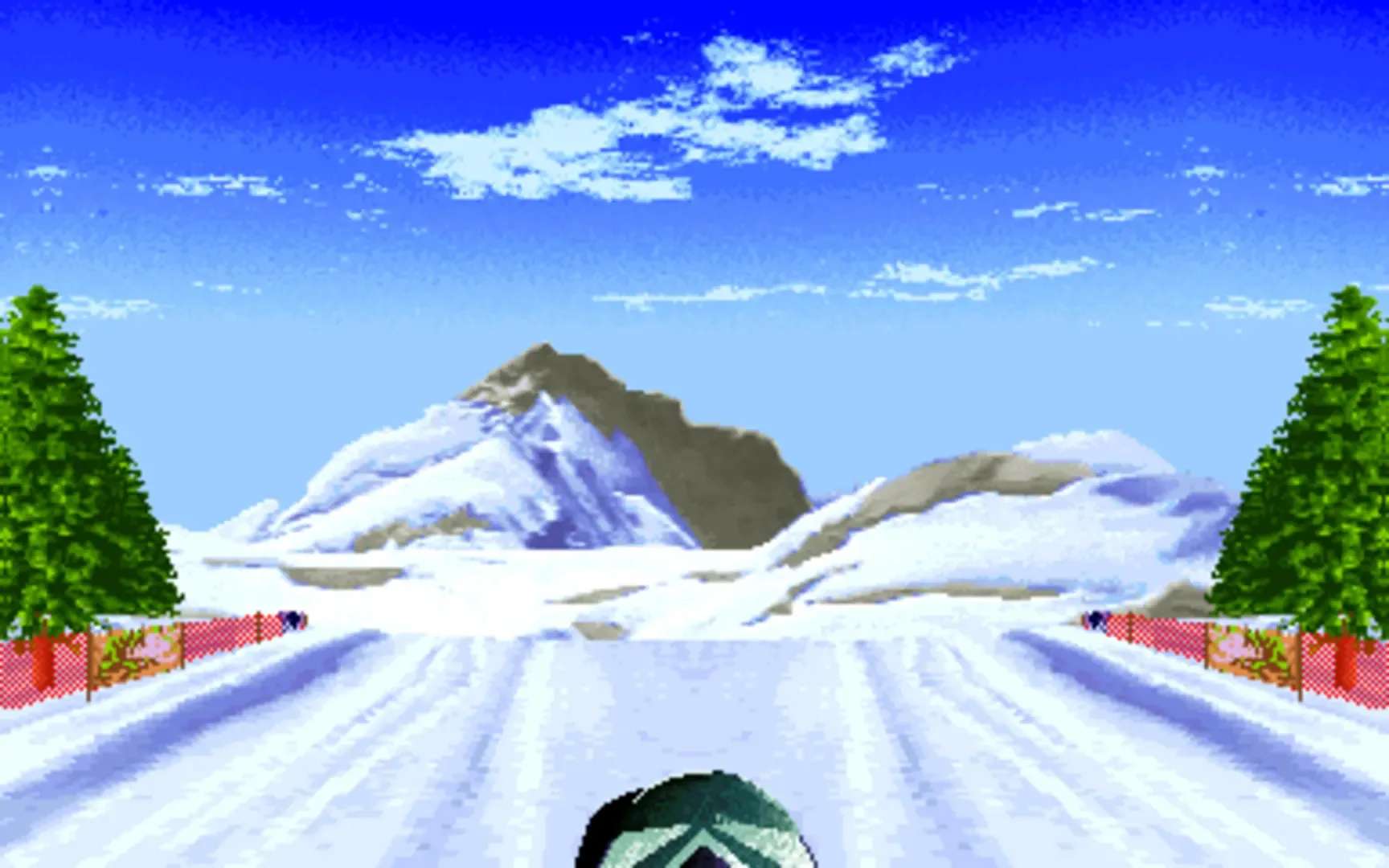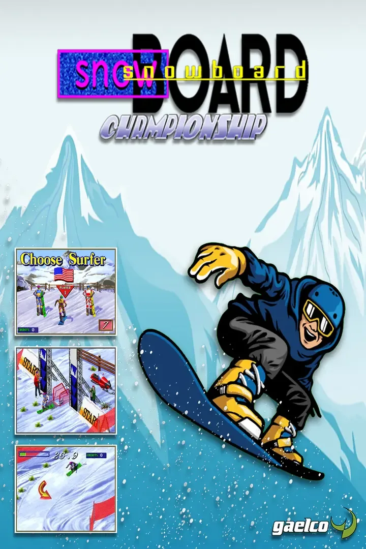 Snowboard Championship is a 2D arcade snowboarding game on courses with gameplay similar to Zigurat's World Rally games. Using a side-scrolling bird's-eye view the snowboarder moves forward automatically and the player has to react quickly to turns and obstacles as signalled by arrows. There are three riders to choose from, representing Europe, Japan and USA, and several courses player either in the Beginner of the Championship mode. Most of the focus is used on the steering, but a single button is used to run and get extra speed after slowing down, for instance after bumping into a board. The racing is always done alone, but each course consists of a qualifying run followed by a real race. To qualify, the course needs to be finished not exceeding the time limit. After completing a course it is possible to do the same course again or to move on to the next course. Next to regular races there are slower slalom races with smaller paths and more focus on steering. Some courses have optional elements such as loopings or jumps that provide bonus points. The game supports two player racing each other taking turns for the best time.