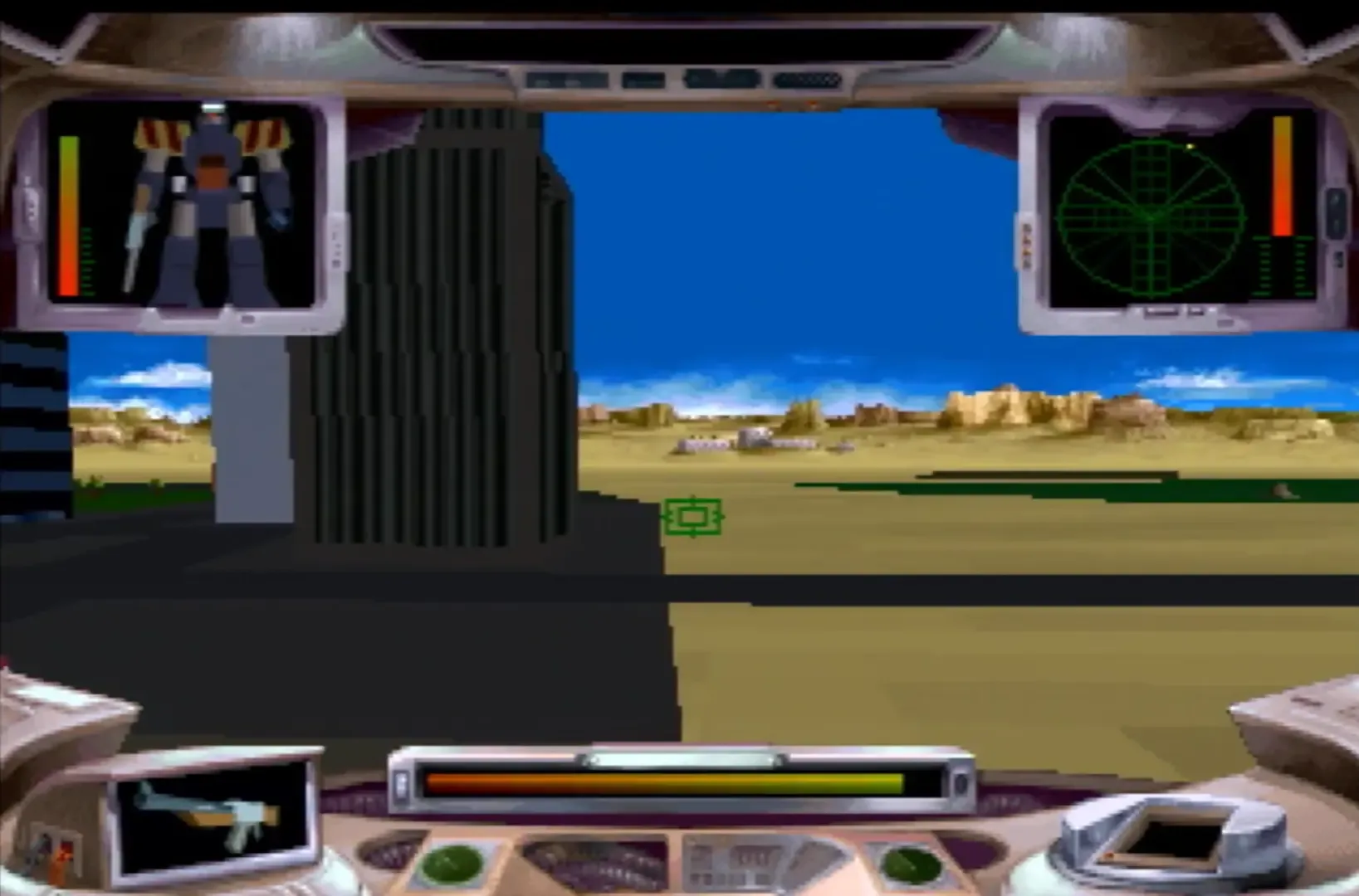 Iron Soldier 2 is a first-person 3D giant mech game. Players must pilot their building-sized robots in a variety of missions ranging from search-and-destroy to surgical attacks to defending objectives. Starting with a limited set of weapons, players can collect more armaments throughout the game. Each weapon can be mounted on a certain part of the robot's body, but once mounted, no other weapons can be placed there. So, while there is a wide range of weapon configurations, not every weapon can be combined with others. Players can destroy buildings in levels to find crates containing new weapons and extra ammunition for current weapons.
