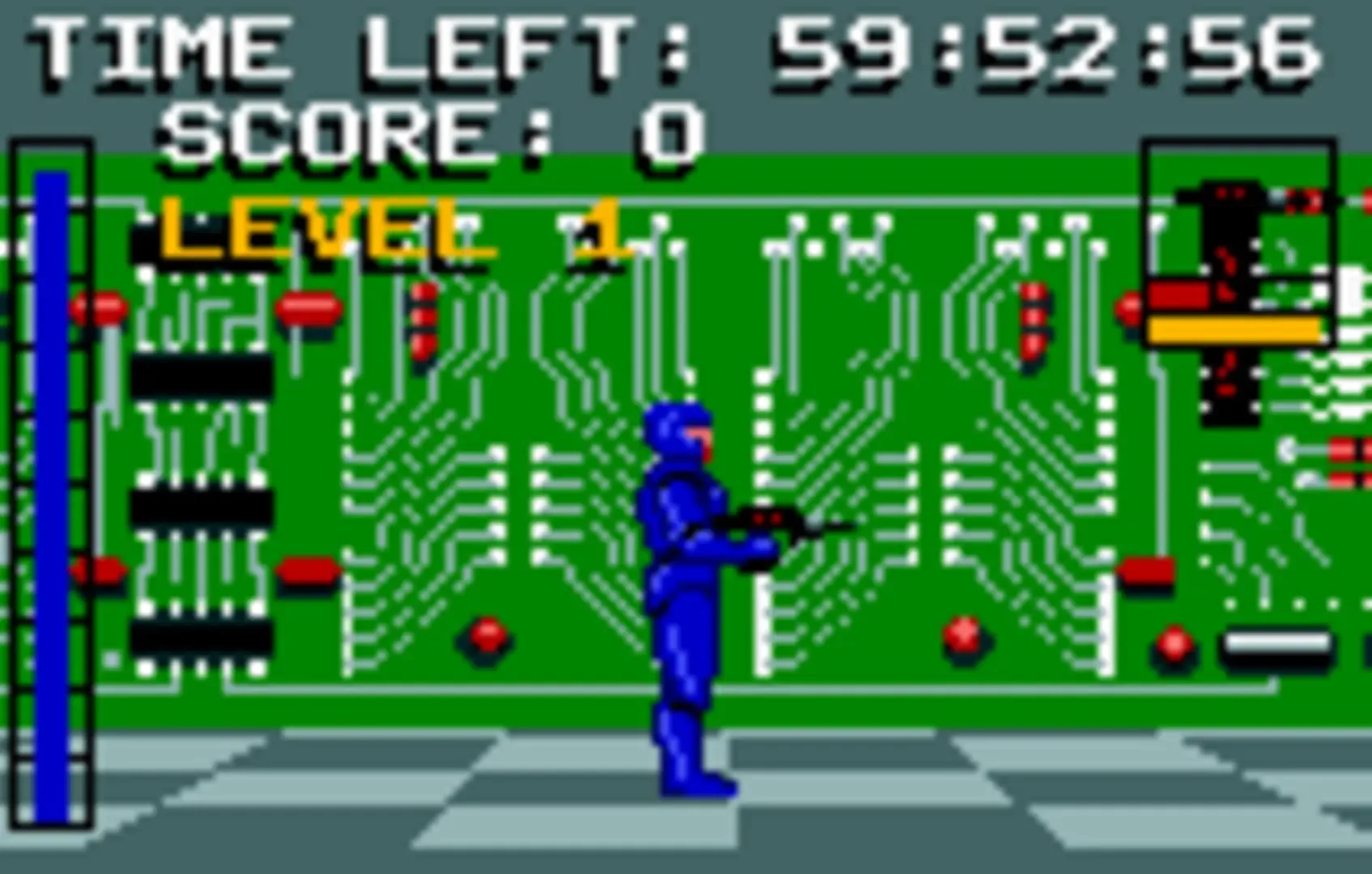 Electrocop is a third-person shooter game in which players starts off with a countdown clock of one hour to complete the task of rescuing the president's daughter. You have to make your way through different levels coming up against different foes. These foes are robots that go by, Walker, Python, Mine, Wall Cannon, Virus and Stringray. To get between each level you have to hack through different doors through a computer interface. While in this interface there are directories of Information where you can learn more about the robots, Programs that disable robots and help hack through codes. Games where you can pass the time by playing games of Meteors, Letter Puzzle and Out Break. Along with Med-pack which heals you and weapon repair to help repair your damaged weapons. There are also different weapons to choose from to help you out during the course of the game. Atari was planning to release a different Electrocop game for the Atari 7800 console. The development was handled by outside contractors. While the game is said to have been finished, a prototype has yet to be found (as of September 2014). However, artwork that Amy Hennig did for the game has appeared on the internet.