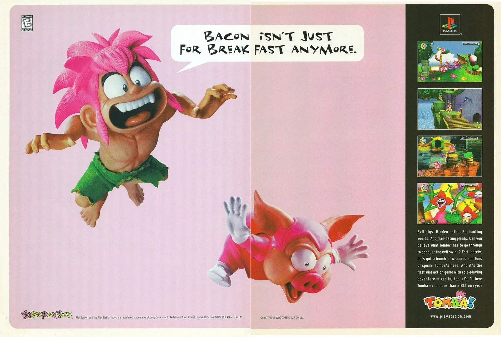 Tomba! is a side-scrolling platformer in which players control Tomba, a wild boy on the search for his grandfather's bangle that was stolen by some evil pigs. Although Tomba is normally restricted to a two-dimensional plane, there are certain points where he can jump or climb onto a new plane. Tomba's main method of attack is to jump on top of enemies to grab them, allowing him to hop around on them before throwing them away. This can also be used to open other objects such as eggs or treasure chests. Tomba is also able to use various projectile weapons such as maces and boomerangs and can swing on branches and poles. The game is based around a mission system, where the main character's (Tomba's) skills are employed to complete various tasks. Completion of a mission gives a certain amount of adventure points (AP) which are required for AP boxes which contain food (which gives you AP and restores 1 space of vitality) or items, and you may for example need 50,000 AP to open one. AP is also used to gain access to special places or information later in the game. Not all missions are necessary to progress in the game, however, they are required to achieve full completion. There are 130 events (missions) in the game, many of them rely on other events to be completed.