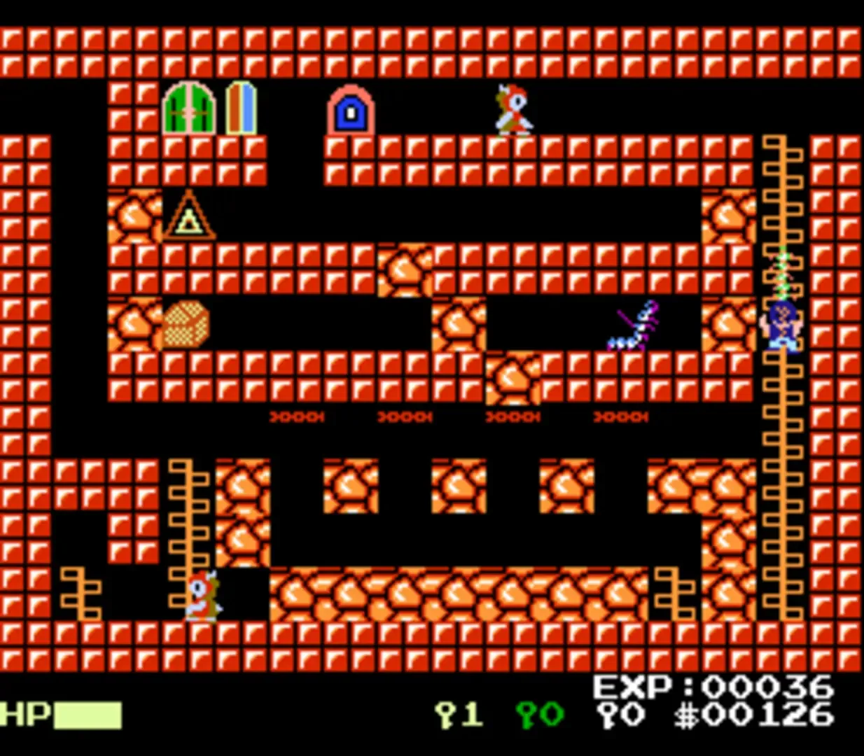 Lutter is a game comprised of single screens full of traps, obstacles, enemies and items that the eponymous hero Lutter must navigate in order to find six missing damsels and the enormous monsters that hold them hostage. The game has some element of non-linearity, as there are numerous paths that split off to explore. The chief goal is to find keys that unlock doors to new areas and eventually to large, screen-sized bosses that Lutter must defeat in shoot 'em up style boss fights. The game also features a few RPG aspects: Lutter has a health bar and can level up, which increases his health and other stats. He defeats enemies by charging into them, similarly to early action RPGs like the first Ys and Hydlide. When defeated, the game will automatically try to bribe the victorious monster with whatever funds the player has accrued: should they have enough to placate the monster (this amount often depends on the strength of the monster) Lutter reappears where he entered the screen with his health restored.