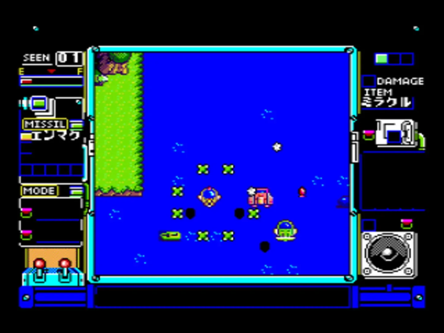 Topple Zip is a vertically scrolling shooter that is marketed as a racing game. The basic premise is that you control an aircraft and fly in competition against several other, computer controlled crafts. In addition to shooting at your opponents, you may ram into them, and they into you. Doing so may dislodge a pill shaped power-up from them which you can then shoot and collect.