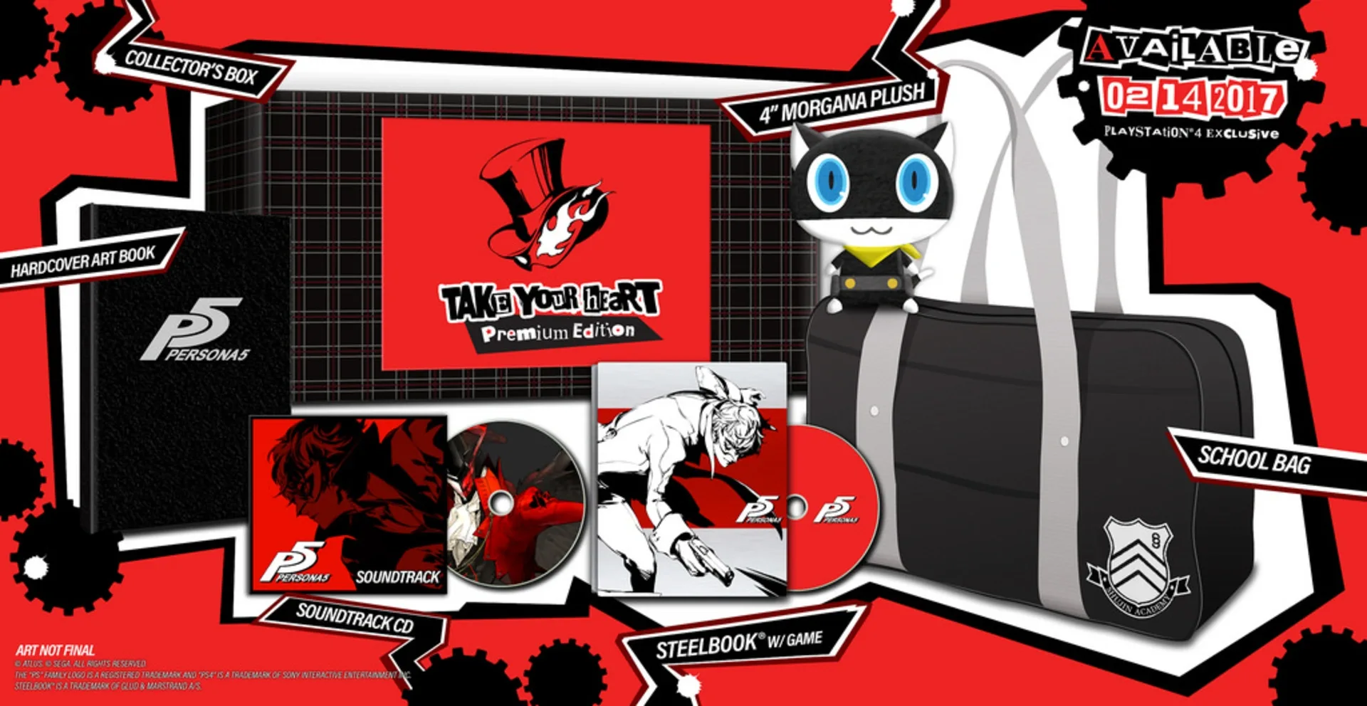 Persona 5 “Take Your Heart” Premium Edition contains: Game, SteelBook Collectible Case, Soundtrack CD, 4" Morgana Plush, 64-page Hardcover Art Book, School Bag & Collectible Outer Box The 5th numbered game in the series, created by renowned developers - A deep and engaging storyline - Each case will take you one step closer to the truth veiled in darkness...What awaits our heroes: glory or ruin? Unique and interesting dungeons with various tricks and traps await - Overcome various obstacles with graceful Phantom Thief action A stable of talented voice actors have provided English voice-overs while ATLUS’ celebrated localization team offers an English script that provides a faithful and engaging play experience
