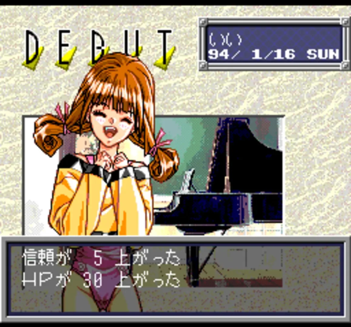 The objective in Tanjou Debut is to train three idols belonging to a small, struggling production company into top stars. The game introduces "rivals," a new feature that adds depth to the gameplay, which was not present in "Sotsugyou". The three heroines form a unit within the game, but depending on the outcome of the Idol Grand Prix, they might go solo, transition to acting, or even marry the manager and pursue a different path. There are nine types of parameters and lessons for each girl. If their parameters drop significantly, they may become ill or turn delinquent. The player must not only understand how to raise the correct stats but also maintain the girls’ trust in the manager to prevent them from skipping lessons.