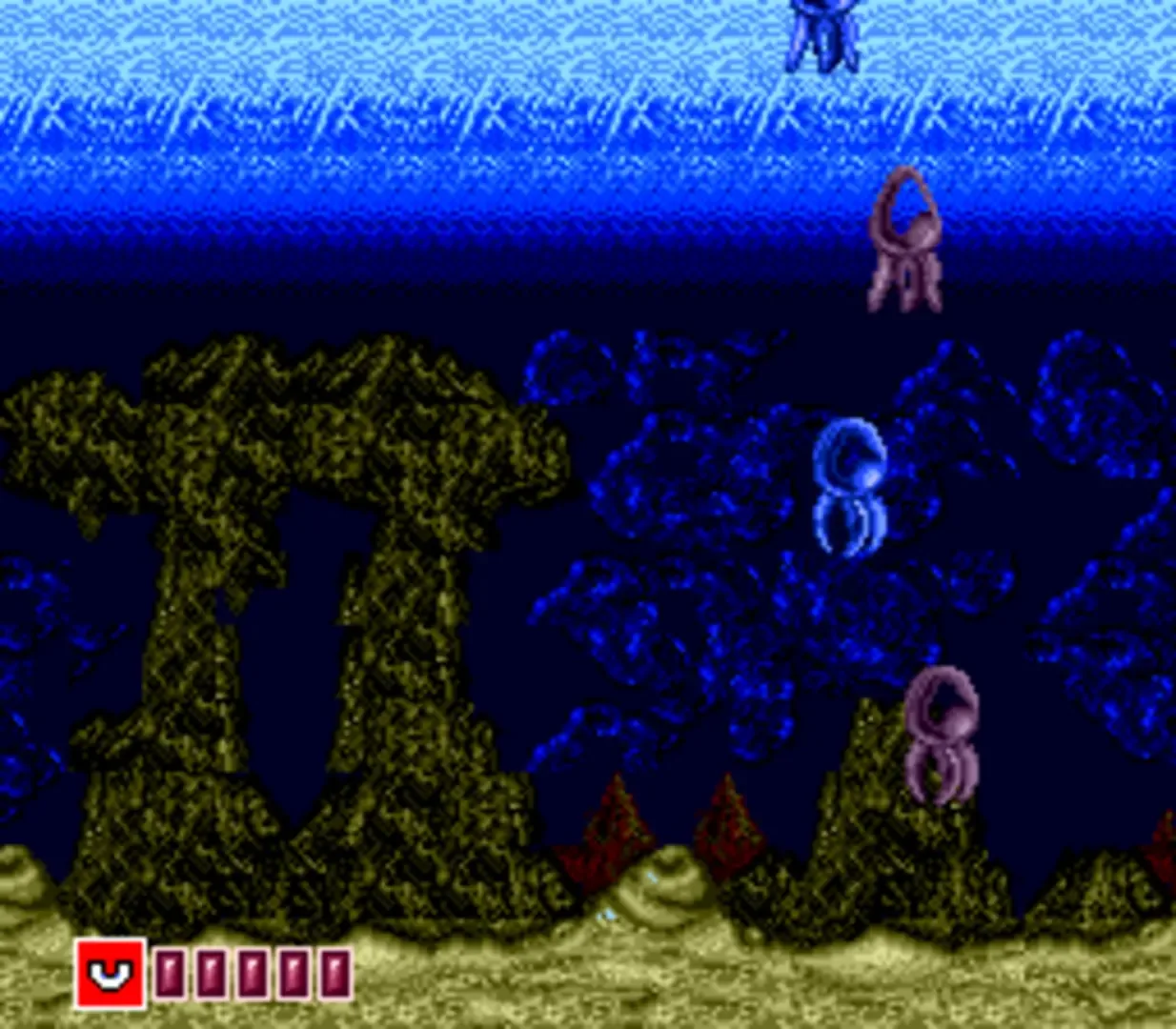 The Engine is hardly lacking in shooters, so to be successful, you have to stand out from the crowd. Barunba tries to add a hint of originality in its own subtle way. You control what is basically a floating globe (complete with little man inside) that has a weapons ring around it - this ring can be rotated right around the ship giving a fully controllable direction of fire, something obviously useful for those pesky critters approaching from behind. From the start, you are equipped with several different types of weapon, each of which can be temporarily boosted by collecting items that are dropped by exploding enemies. The levels are auto-scroll, moving around in all directions and contain mid-level as well as end-of-level bosses. Your ship has an energy bar, located at the bottom left of the screen, and once it is depleted it's 'Game Over'.