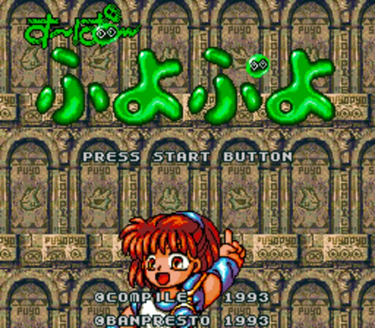 Puyo Puyo is a series of tile-matching video games created by Compile and later Sonic Team. The Super Famicom port (Super Puyo Puyo) features a smaller screen resolution than most console versions, forcing the median to be thinned and the character portrait to be placed in the opponent's field. However, this port retains all of the original's voice acting. Banpresto released a version for the Super Famicom under the name Super Puyo Puyo on December 10, 1993. The object of the game is to defeat the opponent in a battle by filling their grid up to the top with garbage. The Puyos are little creatures with eyes who, in most variations of the game, fall from the top of the screen in a pair. The pair can be moved left and right and rotated. The pair falls until it reaches another puyo or the bottom of the screen.