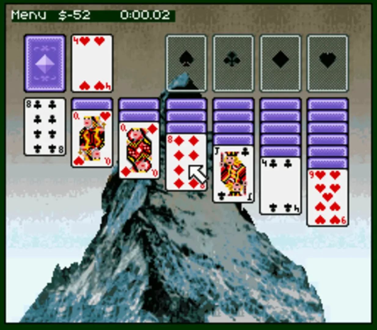 Super Solitaire is a SNES version of the classic solitaire card game with 12 varieties of play (Klondike, Free Cell, Golf, Cruel, Pyramid, Stonewall, Doesn't Matter, Aces Up, Florentine, Poker, Canfield and Scorpion). It features classic artwork for backgrounds along with optional cartoony graphics. Very soft music is included on the track. The game also sports options where you can choose to skip to the next card when stuck or get a hint on what to do.