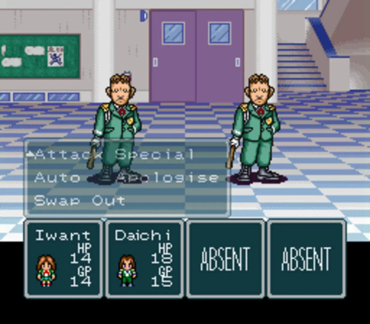 You assume the role of a student (whose gender you can choose) still aboard the flight towards the fictional Utsuho Island of Southern Japan, the location of the strangest school of the country: Hourai High School. This huge educational complex, which houses more than one million students and personnel (how is that even possible?), seems to acts as a magnet for weird youngsters and nonsensical events. And you get the privilege of a great start. Indeed, an irritated stewardess decides to send you to your destination via a shortcut... by throwing you out of the plane with a parachute. After a forced landing through a ceiling, here you are, at Hourai High School. The year hasn't started yet and teachers already have you in their sights. You'll get to meet new friends real soon however, particularly the guys behind the school's newspaper "Hourai Sports". You'll even get the chance to take the place of the editor, even though you are the one who sent him to hospital by landing on his head. But the course of your new school year will soon be disrupted by the establishment of extravagantly oppressive school laws, which seem to be manipulated from behind the throne. Some may compare this game to Mother 2, seeing the delirious scenario and modern setting. They wouldn't be entirely wrong, as Hourai Gakuen no Bouken, more than its atypical universe, shares with it classical RPG gameplay and first-person battles. The progression is pretty different, though. It's based on the school campus's map, with each of its parts constituting "villages" of some sort, and to which the player will be required to come back regularly to use the services housed in the main buildings. The limits of the world map will widen as the chapters that lead us through the school year unfold, and more exotic and less "academic" regions will gradually make their apparition.