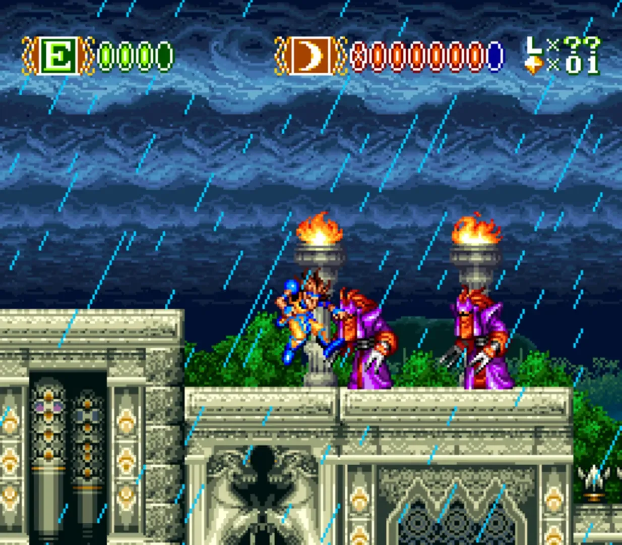 Arianna, a young sorceress, has been kidnapped by Ashura. Sky has pledged his life to rescuing her. Sky must venture through many colorful stages and nice background effects. Skyblazer is a blend of side-scrolling fighting with magical skills. Locating potions to recover energy and gaining magic points to thrash the enemies becomes a major part of the gameplay. Sky can also stick to and climb vertically up walls.