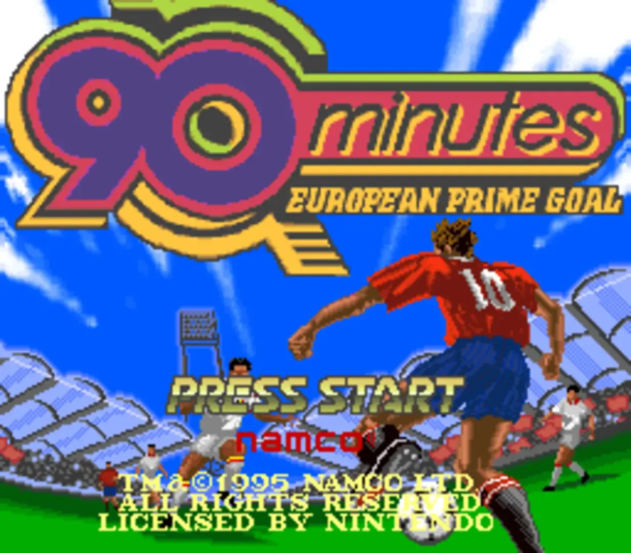 90 Minutes: European Prime Goal is a Super Nintendo Entertainment System soccer video game. The player(s) get to play in either exhibition, tournament, or in the all-star mode. The view is from a left-right perspective and the national flags of several European countries are used in the game. In the game mode "You're a Hero," the player must make miracle plays that either win and/or change the game. The kick-off is doing using 3D graphics with the camera showing the spectators in the grandstand. This game is a regional port of the sequel to J.League Soccer Prime Goal 2 and J.League Soccer Prime Goal, which were both developed by Namco.